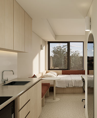 Mahasiswa dapat memilih antara apartemen berbagi dua kamar atau kamar studio pribadi. Semua penghuni dapat menikmati fasilitas bersama di Iglu, termasuk gym, area belajar, dan teras luar ruangan.